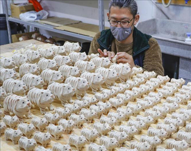 Mô hình Hổ biểu tượng cho Năm Nhâm Dần làm bằng gốm trưng bày tại Koka, tỉnh Shiga, Nhật Bản. Ảnh: Kyodo/TTXVN