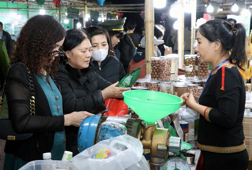 Nhân dân địa phương mua các sản phẩm nông sản các vùng miền tại lễ hội. Ảnh: Thu Hằng-TTXVN