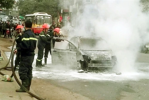 | Lực lượng Cảnh sát phòng cháy, chữa cháy tại hiện trường. Ảnh Thu Hằng - TTXVN |