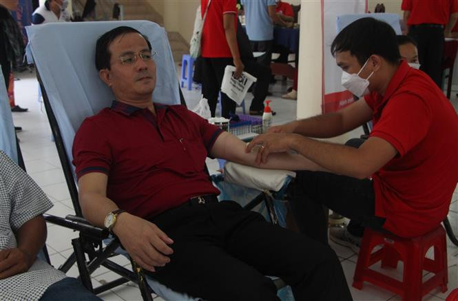 Lãnh đạo tỉnh Hậu Giang tham gia hiến máu nhân đạo sau lễ phát động. Ảnh: Hồng Thái - TTXVN