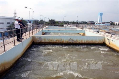 | Công nhân nhà máy nước Tân Hiệp, huyện Hóc Môn, Thành phố Hồ Chí Minh kiểm tra bể nước từ trạm bơm nước thô Hòa Phú bơm về nhà máy. Ảnh: Hoàng Hải-TTXVN |