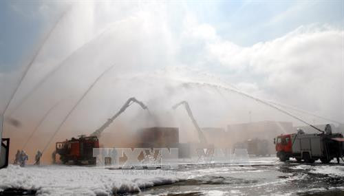 Các lực lượng phòng cháy chữa cháy và tìm kiếm cứu nạn khẩn cấp dập tắt đám cháy do hóa chất gây ra bằng vòi rồng, bọt, nước; 2 lăng phun chữa cháy áp lực cao có tích hợp hệ thống điển tử chữa cháy có tầm phun xa đến 70m được sử dụng để dập tắt đám cháy.
