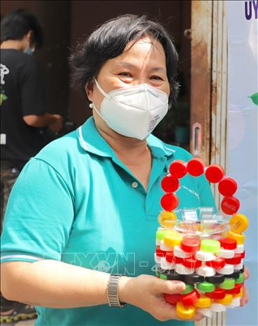 Cô Nguyễn Thị Cẩm, tình nguyện viên của chương trình đã dùng các nắp chai nhựa thu được để làm "chậu" trồng cây. Ảnh: Hồng Giang - TTXVN