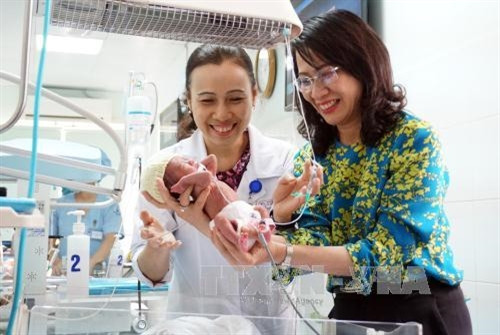 | Bà Nguyễn Thị Thu, Phó Chủ tịch Ủy ban Nhân dân Thành phố Hồ Chí Minh đến thăm cháu bé bị tim bẩm sinh phức tạp sau khi phẫu thuật thành công. Ảnh: Phương Vy-TTXVN |