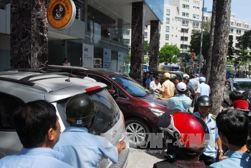 | Lực lượng chức năng xử lý các ô tô đậu lấn chiếm lề đường Nguyễn Thái Bình. Ảnh: Mạnh Linh - TTXVN |