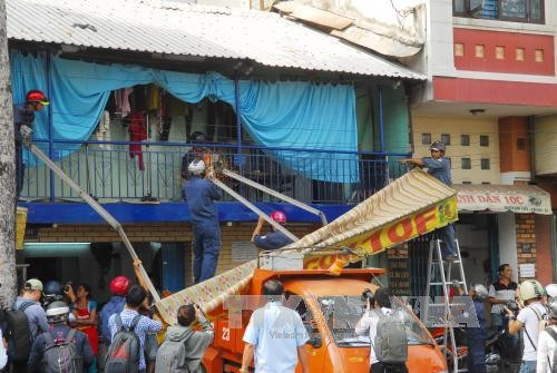 | Lực lượng chức năng tiến hành tháo dỡ nhiều trường hợp nhà dân dựng mái che, biển hiệu chiếm vỉa hè đường Nguyễn Đình Chiểu (phường Đa Kao, quận 1). Ảnh: Mạnh Linh-TTXVN |