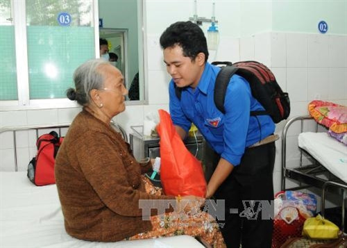 | Các đoàn viên thanh niên trao tặng quà Tết cho bệnh nhân tại Bệnh viên Phạm Ngọc Thạch Ảnh: An Hiếu - TTXVN |