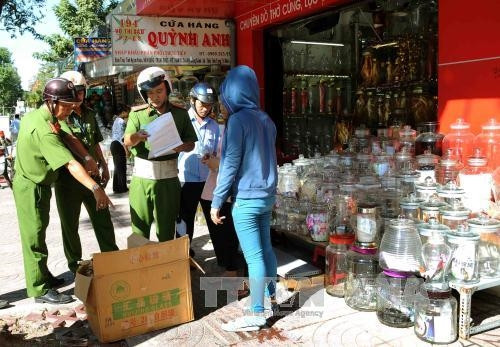 | Lập biên bản xử lý vi phạm một hộ kinh doanh lấn chiếm vỉa hè trên đường Võ Thị Sáu, quận 3. Ảnh: An Hiếu - TTXVN |