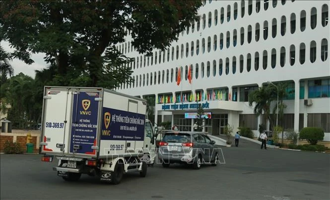 Vận chuyển vaccine đến Bệnh viện Bệnh Nhiệt đới Thành phố Hồ Chí Minh. Ảnh: Đinh Hằng-TTXVN