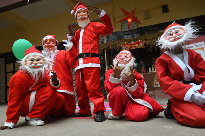 Các em nhỏ trong trang phục Ông già Noel tại Chennai, Ấn Độ, ngày 7/12/2022. Ảnh: AFP/ TTXVN