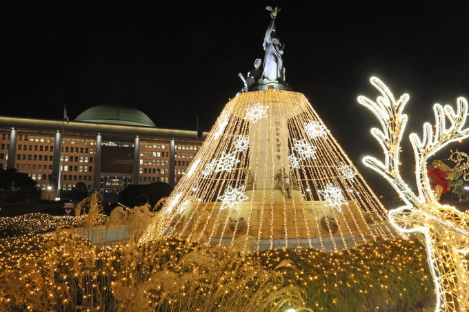 Cây thông Noel được thắp sáng rực rỡ tại tòa nhà Quốc hội Hàn Quốc ở thủ đô Seoul ngày 7/12/2022. Ảnh: Yonhap/ TTXVN