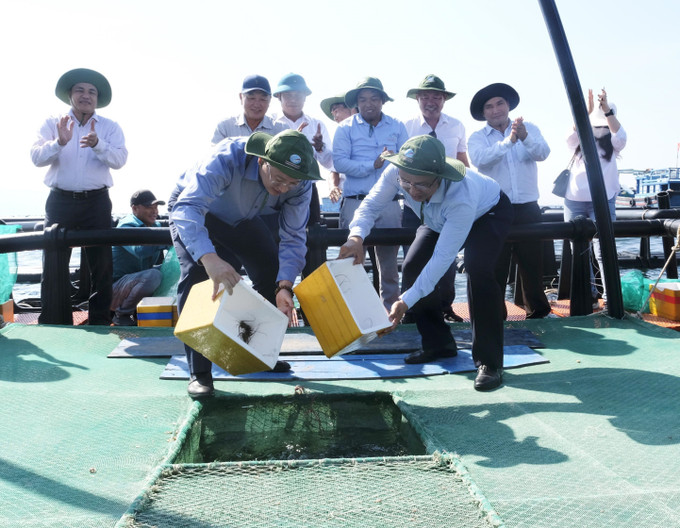 Ông Nguyễn Hải Ninh, Ủy viên Ban Chấp hành Trung ương Đảng, Bí thư Tỉnh ủy Khánh Hòa cùng lãnh đạo tỉnh thả tôm hùm xuống lồng HDPE tại vùng biển Cam Ranh. Ảnh: Đặng Tuấn –TTXVN