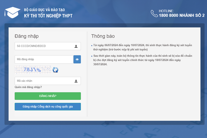 Thí sinh sử dụng tài khoản và mật khẩu đã được cấp để đăng nhập vào Hệ thống (thisinh.thitotnghiepthpt.edu.vn) thực hành đăng ký xét tuyển theo đúng quy trình và thời gian quy định.