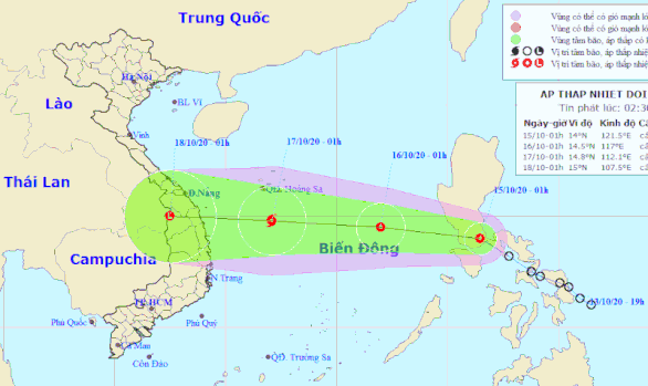 Theo Trung tâm Dự báo Khí tượng Thủy văn Quốc gia, lúc 1 giờ ngày 15/10, vị trí tâm áp thấp nhiệt đới ở khoảng 14,0 độ Vĩ Bắc; 121,5 độ Kinh Đông, ngay trên khu vực miền Trung Philippines. Sức gió mạnh nhất vùng gần tâm áp thấp nhiệt đới mạnh cấp 6 (40-50 km/giờ), giật cấp 8.
