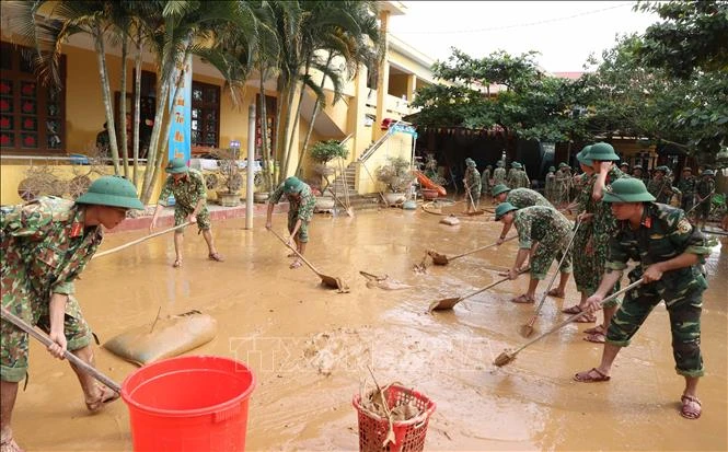 Lực lượng đoàn viên thanh niên dọn dẹp vệ sinh trường Mầm non thị trấn Kiến Giang, huyện Lệ Thủy (Quảng Bình). Ảnh: Danh Lam-TTXVN