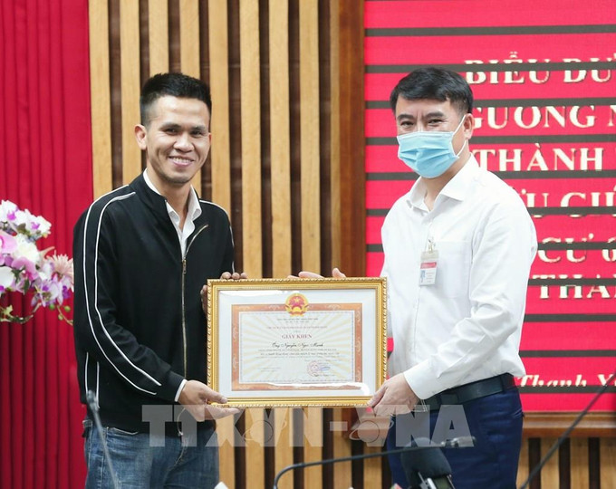 Ông Nguyễn Xuân Lưu, Bí thư Quận uỷ, Chủ tịch UBND quận Thanh Xuân tặng Giấy khen biểu dương tài xế xe tải Nguyễn Ngọc Mạnh (31 tuổi, quê ở huyện Đông Anh) chiều 1/3. Ảnh: Doãn Tấn - TTXVN