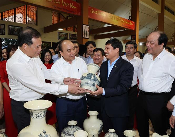 Thủ tướng Chính phủ Nguyễn Xuân Phúc đến thăm Công ty Cổ phần Gốm Chu Đậu, xã Thái Tân, huyện Nam Sách. Ảnh: Thống Nhất - TTXVN