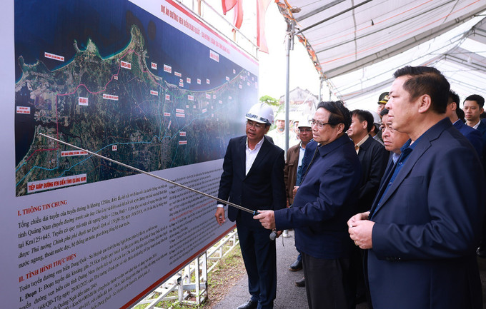 Tiếp đó, Thủ tướng Chính phủ Phạm Minh Chính kiểm tra tình hình triển khai dự án đường bộ quan trọng trên địa bàn tỉnh Quảng Ngãi gồm: đường ven biển Dung Quất – Sa Huỳnh và cao tốc Quảng Ngãi - Hoài Nhơn để động viên lực lượng thi công và tiếp tục tháo gỡ các khó khăn, vướng mắc, thúc đẩy các dự án.