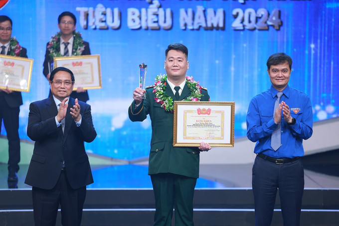 Thủ tướng Phạm Minh Chính và Bí thư Thứ nhất Trung ường Đoàn TNCS Hồ Chí Minh Bùi Quang Huy trao Giải thưởng Gương mặt trẻ Việt Nam tiêu biểu năm 2024 trong lĩnh vực trong lĩnh vực nghiên cứu khoa học cho Hoàng Khắc Hiếu, Trưởng phòng phát triển 2, Trung tâm giải pháp Chính phủ, Tổng Công ty giải pháp doanh nghiệp, Tập đoàn Công nghiệp-Viễn thông Quân đội Viettel. Ảnh: Dương Giang-TTXVN