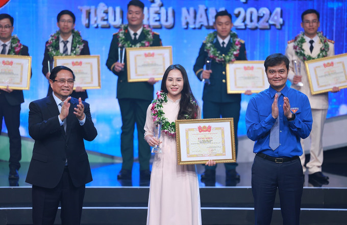 Thủ tướng Phạm Minh Chính và Bí thư Thứ nhất Trung ường Đoàn TNCS Hồ Chí Minh Bùi Quang Huy trao Giải thưởng Gương mặt trẻ Việt Nam tiêu biểu năm 2024 trong lĩnh vực học tập cho sinh viên Trường Đại học Bách khoa Hà Nội Thân Thế Công. Ảnh: Dương Giang-TTXVN