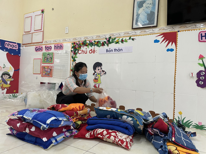 Lực lượng phụ nữ xã Phú Thuận (huyện Phú Vang, tỉnh Thừa Thiên- Huế) tham gia giúp đỡ, chuẩn bị cơ sở vật chất tại các điểm tránh trú bão. Ảnh: Mai Trang-TTXVN