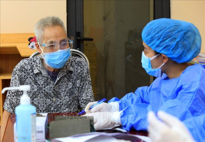 Ông Trịnh Xuân Nghĩa (77 tuổi), phường Trung Hòa, quận Cầu Giấy được nhân viên y tế tư vấn trước khi tiêm vaccine phòng COVID-19 . Ảnh: Tuấn Anh - TTXVN