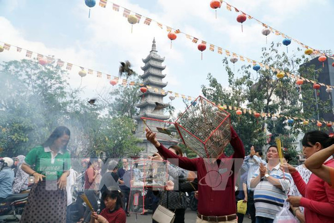 Phóng sinh tại chùa Vĩnh Nghiêm, quận 3, với mong muốn một năm bình an đến với gia đình. Ảnh: Phương Vy- TTXVN.