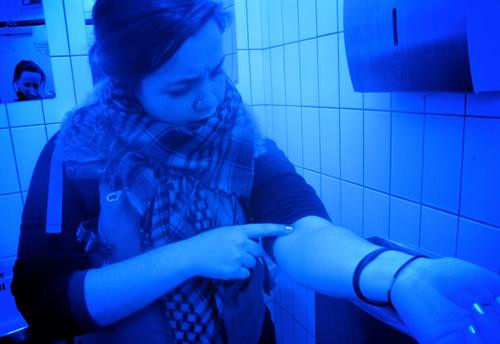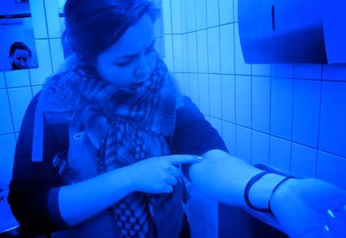 Nghe tưởng chứng như họ định biến cả nhà vệ sinh thành hộp đêm nhưng không phải. Màu đèn này để ngăn ngừa những người nghiện ma túy vào đây chích thuốc, bởi màu đèn xanh sẽ khiến cho họ không thể tìm thấy đường ven trên tay.