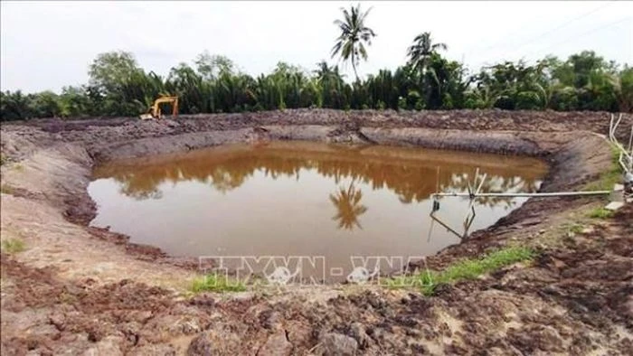 Nông dân Đồng bằng sông Cửu Long xây dựng ao tích trữ nước ngọt. Ảnh: TTXVN