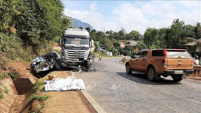 Hiện trường vụ tai nạn giao thông làm 1 người tử vong, 4 người bị thương xảy ra ngày 8/2/2021 tại khúc cua thuộc Km220 trên Quốc lộ 6 đoạn qua huyện Yên Châu, tỉnh Sơn La. Ảnh: Hữu Quyết - TTXVN