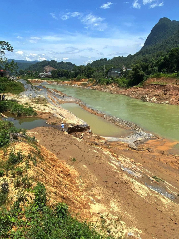 Công trình Dự án kè bờ sông Miện không được đơn vị thi công cảnh báo nguy hiểm và dựng rào chắn. Ảnh: TTXVN phát