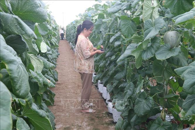 Trồng dưa lưới trong nhà màng ở huyện Gò Công Tây. Ảnh: Minh Trí-TTXVN