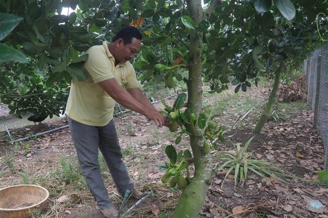 Bà con nông dân chăm sóc mít trong vườn. Ảnh: Minh Trí-TTXVN