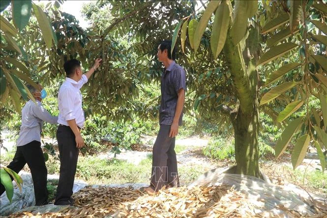 Đánh giá hiệu quả cây ra hoa trái vụ trong quá trình phủ bạt nylon. Ảnh: Minh Trí-TTXVN