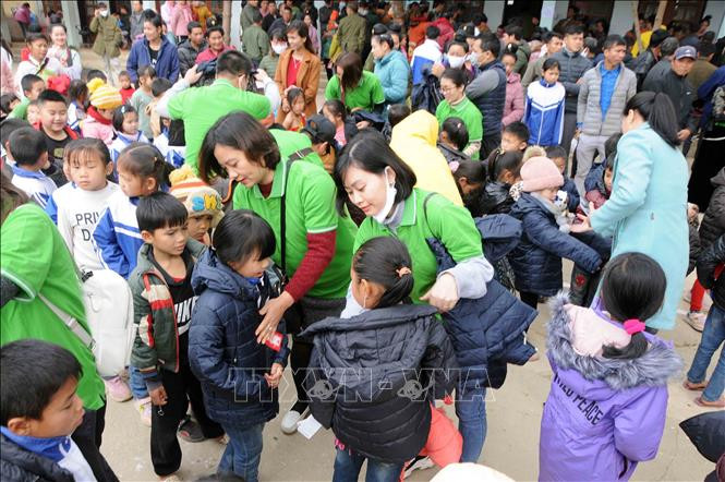 BTC tặng áo ấm các em học sinh trường TH và THCS xã Mường Và. Ảnh: Quang Quyết-TTXVN