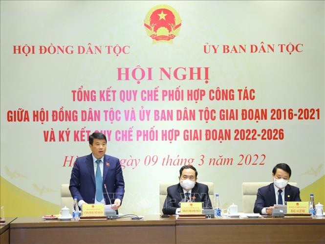 Phát biểu tại hội nghị, Phó Chủ tịch Thường trực Quốc hội Trần Thanh Mẫn ghi nhận, đánh giá cao và biểu dương những nỗ lực, kết quả hoạt động của Hội đồng Dân tộc, Ủy ban Dân tộc trong năm 2021 nói riêng và giai đoạn 2016 - 2021 nói chung. Hai cơ quan đã chủ động xây dựng dự thảo Quy chế phối hợp công tác giai đoạn 2022- 2026, với nội dung khá toàn diện, gồm 5 nhóm nội dung, cụ thể thành 14 đầu công việc. Các nội dung đề ra sát với thực tiễn, sát với Chương trình hành động thực hiện Nghị quyết Đại hội XIII của Đảng của Đảng đoàn Quốc hội cũng như Chương trình hành động của Chính phủ. Mục tiêu bao trùm là thực hiện thắng lợi Nghị quyết Đại hội XIII của Đảng; Kế hoạch phát triển kinh tế- xã hội 2021-2025; Nghị quyết số 88/2019/QH14 của Quốc hội Phê duyệt Đề án tổng thể phát triển kinh tế - xã hội vùng đồng bào dân tộc thiểu số và miền núi giai đoạn 2021-2030 và Nghị quyết số 120/2020/QH14 của Quốc hội Phê duyệt chủ trương đầu tư Chương trình mục tiêu quốc gia phát triển kinh tế - xã hội vùng đồng bào dân tộc thiểu số và miền núi giai đoạn 2021 - 2030; đánh giá toàn diện những tác động của dịch COVID-19 tới đồng bào, trên cơ sở đó xác định rõ các nhiệm vụ trọng tâm của từng năm để thích ứng an toàn, linh hoạt, kiểm soát hiệu quả dịch bệnh và nhanh chóng phục hồi, phát triển kinh tế - xã hội, bảo đảm an sinh xã hội.