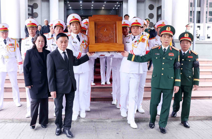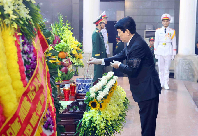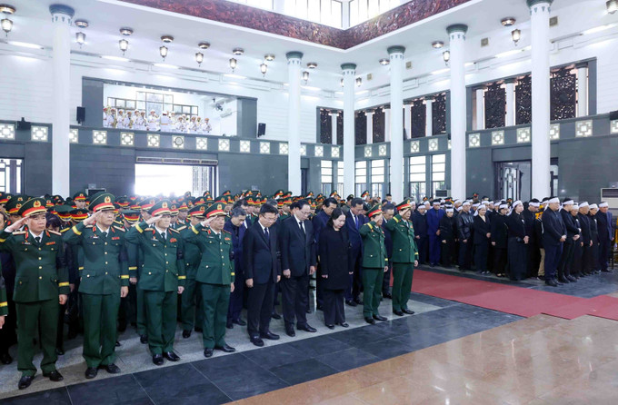 Nguyên Tổng Bí thư Nông Đức Mạnh, nguyên Chủ tịch Quốc hội Nguyễn Văn An cùng các Ủy viên Bộ Chính trị: Chủ tịch nước Lương Cường; Chủ tịch Quốc hội Trần Thanh Mẫn; Thường trực Ban Bí thư, Chủ nhiệm Ủy ban Kiểm tra Trung ương Trần Cẩm Tú; Bí thư Trung ương Đảng, Chủ tịch Ủy ban Trung ương Mặt trận Tổ quốc Việt Nam Đỗ Văn Chiến; Bí thư Trung ương Đảng, Phó Thủ tướng Thường trực Chính phủ Nguyễn Hòa Bình; Bí thư Thành ủy Hà Nội Bùi Thị Minh Hoài... tham gia đoàn viếng.