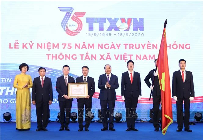 Thủ tướng Nguyễn Xuân Phúc, Chủ tịch Hội đồng Thi đua-Khen thưởng Trung ương trao tặng Huân chương Lao động hạng Nhất cho Thông tấn xã Việt Nam (15/9/1945-15/9/2020). Ảnh: Thống Nhất - TTXVN