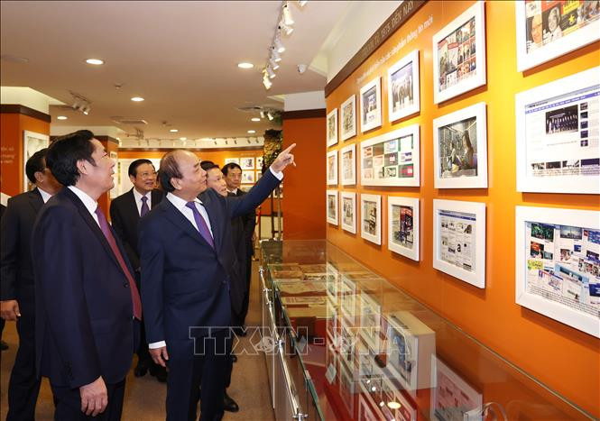 Thủ tướng Nguyễn Xuân Phúc và các đại biểu tham quan Phòng truyền thống của TTXVN. Ảnh: Thống Nhất - TTXVN