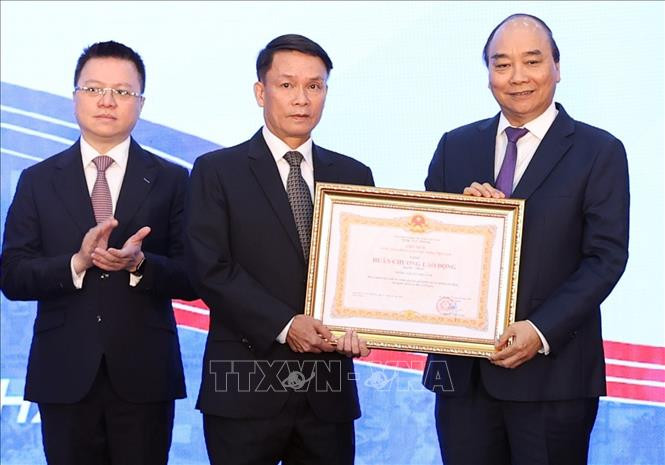 Thủ tướng Nguyễn Xuân Phúc, Chủ tịch Hội đồng Thi đua-Khen thưởng Trung ương trao tặng Huân chương Lao động hạng Nhất cho Thông tấn xã Việt Nam. Ảnh: Thống Nhất - TTXVN