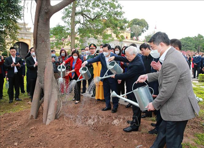 Sau lễ dâng hương, thực hiện Lời căn dặn của Chủ tịch Hồ Chí Minh: "Mùa xuân là Tết trồng cây, làm cho đất nước càng ngày càng xuân”, Tổng Bí thư, Chủ tịch nước Nguyễn Phú Trọng cùng các đồng chí lãnh đạo Trung ương và thành phố Hà Nội đã trồng cây lưu niệm tại Trung tâm Hoàng Thành Thăng Long.