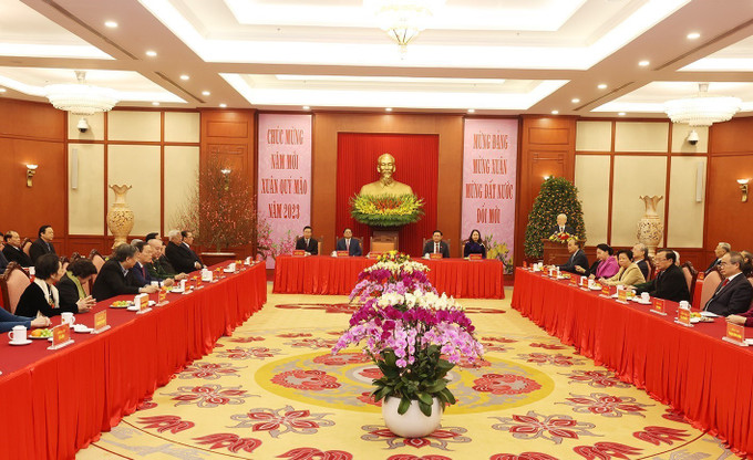 Trong không khí cả nước chào đón năm Quý Mão - 2023, mừng Đảng Cộng sản Việt Nam 93 tuổi (3/2/1930-3/2/2023), sáng 19/1 (tức ngày 28 tháng 12 năm Nhâm Dần), tại Trụ sở Trung ương Đảng, Tổng Bí thư Nguyễn Phú Trọng đã gặp mặt, chúc Tết các đồng chí lãnh đạo, nguyên lãnh đạo Đảng, Nhà nước, Mặt trận Tổ quốc Việt Nam.
