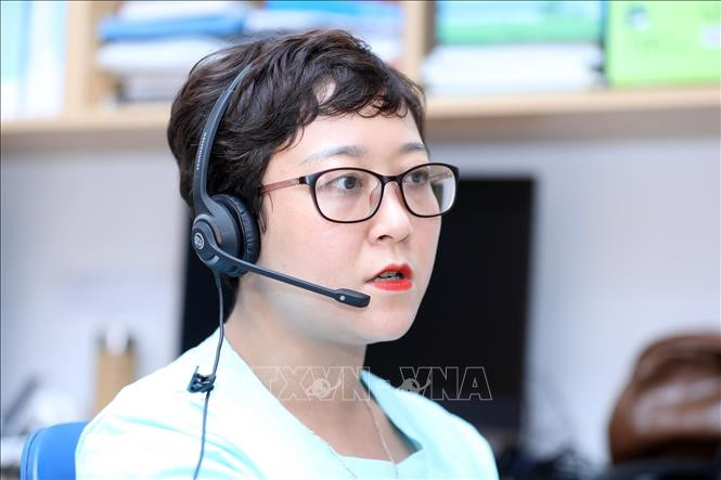 Chị Hoàng Lê Thủy, nhân viên tư vấn của Tổng đài điện thoại quốc gia bảo vệ trẻ em 111 đặt tại Hà Nội, trả lời các cuộc gọi. Ảnh: Anh Tuấn – TTXVN