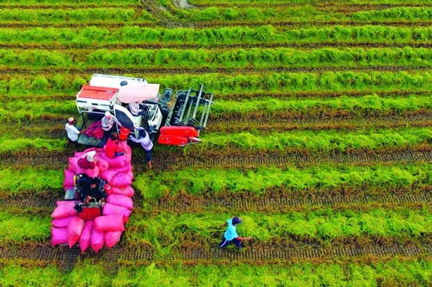 Thu hoạch lúa bằng máy gặt đập liên hợp tại xã Phước Hưng, huyện Trà Cú (Trà Vinh). Ảnh: Phúc Thanh - DTMN