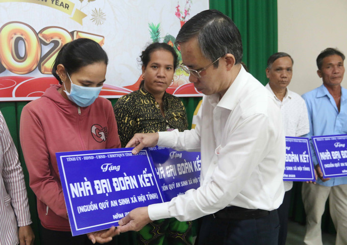 Trao bảng tượng trưng bàn giao nhà Đại đoàn kết cho hộ nghèo. Ảnh: Thanh Hòa- TTXVN