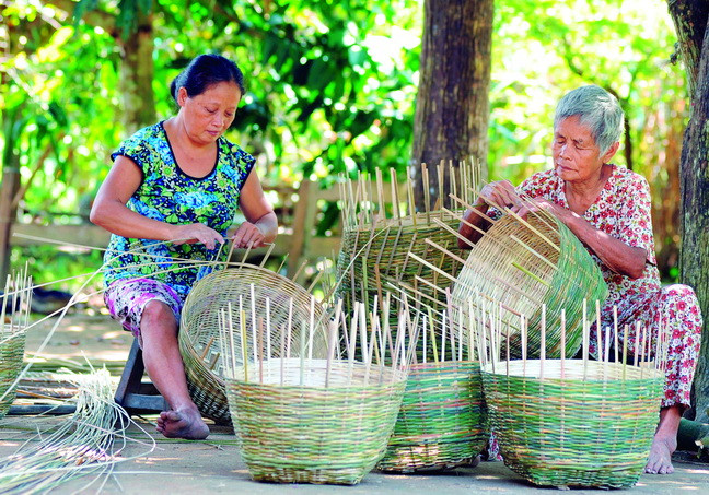 Làng nghề đan lát các sản phẩm từ tre, trúc ở ấp Giồng Đình, xã Đại An, huyện Trà Cú (Trà Vinh) mỗi năm sản xuất hàng chục ngàn sản phẩm giỏ, thúng, rổ…, tạo việc làm ổn định cho hàng trăm lao động dân tộc Khmer tại địa phương. Ảnh: Phúc Thanh - DTMN