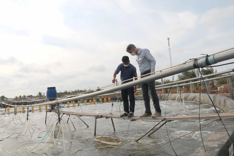 Mô hình nuôi tôm siêu thâm canh mật độ cao của người dân thị xã Duyên Hải, Trà Vinh. Ảnh: Thanh Hòa - TTXVN
