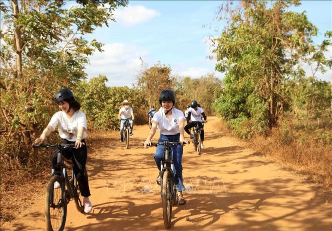 Du khách đạp xe trải nghiệm từ thác Dray Nur qua thác Gia Long. Ảnh: Hoài Thu – TTXVN
