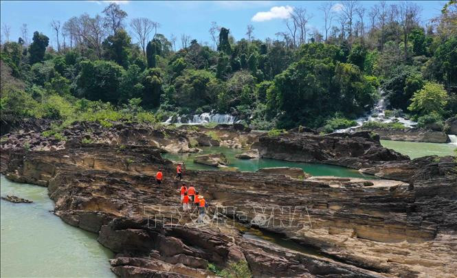 Du khách đi bộ trên những triền đá núi lửa cổ xưa ở cụm thác Gia Long – Dray Nur, tỉnh Đắk Lắk. Ảnh: Hoài Thu – TTXVN