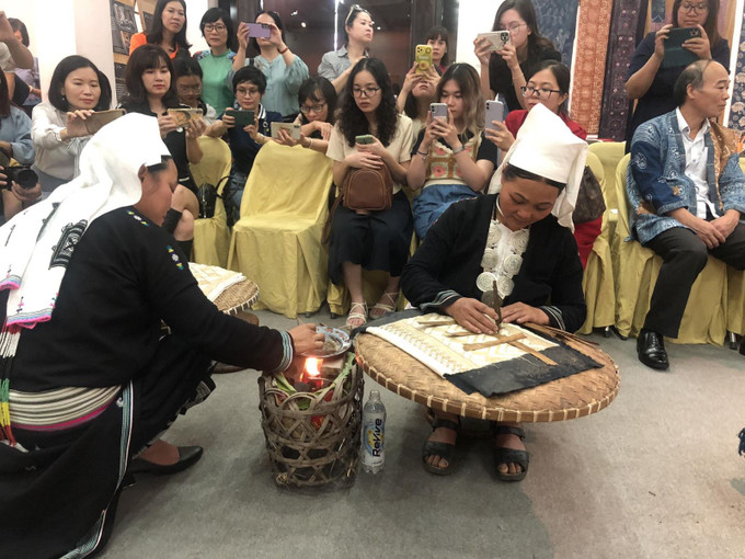 Phụ nữ dân tộc Dao (nhóm Dao Tiền ở xã Hoài Khao, huyện Nguyên Bình, tỉnh Cao Bằng) trình diễn vẽ sáp ong tại sự kiện. Ảnh: Phương Lan - TTXVN